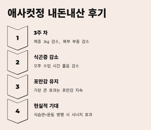 3주 차쯤 되니까 확실히 효과가 체감됐어. 체중은 3kg 정도 빠졌고, 복부가 눈에 띄게 덜 부풀었어. 특히 ‘식곤증’이 줄어서 오후 수업 시간에 졸던 것도 줄더라. 나한테 가장 큰 효과는 포만감 유지였어.