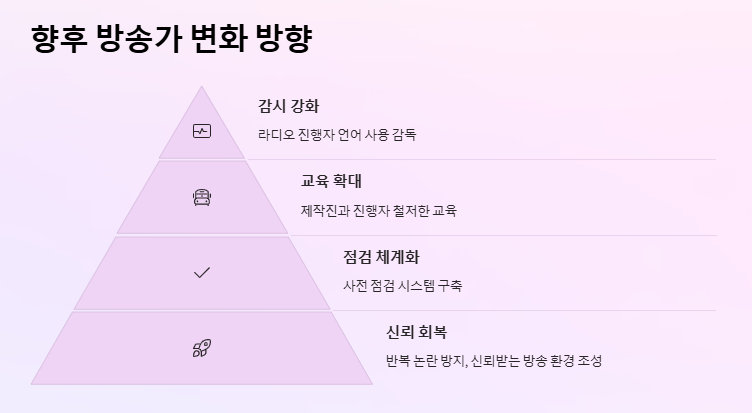 방심위는 이번 사건을 계기로, 라디오 진행자들의 언어 사용에 대한 감시를 강화하겠다고 밝혔다. 제작진과 진행자들에게는 더욱 철저한 교육과 점검이 요구된다. 이러한 변화가 반복되는 논란을 막고, 신뢰받는 방송 환경을 만들어갈 수 있을 것이다.