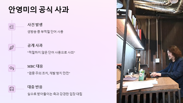 사건 직후 안영미는 방송을 통해 공개 사과를 했다. “적절하지 않은 단어 사용으로 놀라셨을 청취자 분들께 사죄드린다”며 고개를 숙였고, MBC 측 역시 “진행자에게 엄중히 주의 조치하고 향후 재발 방지에 만전을 기하겠다”고 밝혔다.
