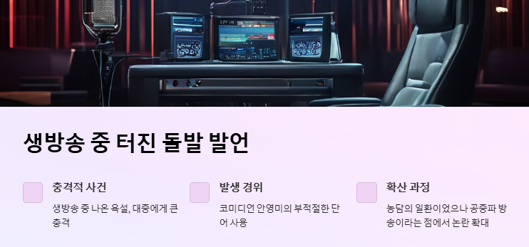 생방송 중 나온 욕설은 대중에게 큰 충격을 주기에 충분했다. 안영미 욕설 논란은 코미디언 안영미가 ‘두시의 데이트’ 생방송 중 사용한 부적절한 단어에서 비롯됐다. 상황은 농담의 일환이었지만, 공중파 방송에서 나온 표현이라는 점에서 사회적 논란으로 확대됐다.