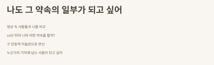 사실 처음엔 그냥 영상 하나 보고 감동받은 거였는데, 자꾸 생각이 나는 거예요. '안동역 다큐 3일'을 다시 보기 시작하면서, 영상 속 사람들과 저 자신을 비교하게 됐어요. 나는 10년 뒤의 나와 어떤 약속을 할 수 있을까? 그 약속을 지키려면 지금 어떤 나여야 할까?