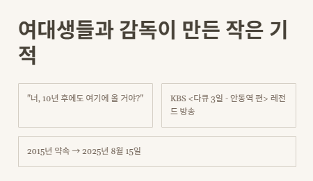 유튜브 영상: KBS 다큐 “2025년 8월 15일, 안동역, 10년 전 청춘들의 약속” → 바로가기