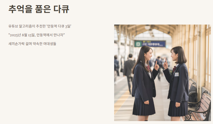요즘은 유튜브 알고리즘이 참 기가 막히죠. 제가 기차 여행 브이로그 몇 개 봤다고 갑자기 ‘안동역 다큐 3일’이라는 영상이 추천되는 거예요. 처음에는 그저 옛날 방송인 줄 알았는데, 자막에 “2025년 8월 15일, 안동역에서 만나자”라고 뜨는 순간, 뭔가 가슴이 먹먹해졌어요.