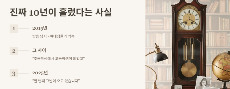 처음엔 “그냥 예능 속 장면처럼 감성 포장한 거겠지”라고 생각했어요. 그런데 시간이 흐르고 흐르면서 진짜 10년이 흘렀다는 게 너무 놀라운 거예요. 10년이면 강산도 변한다는데, 그 사이에 저는 초등학생에서 고등학생이 되었고, 방송에 나왔던 여대생 언니들은 어엿한 사회인이 되어 있을 거잖아요?