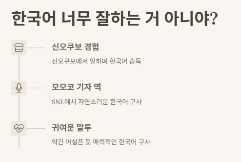 처음엔 ‘한국어 좀 하겠지~’ 하고 봤는데, 방송 보면 그냥 거의 한국인 느낌이야. SNL 코리아에서 모모코 기자 역 맡아서 나온 거 보면 진짜 자연스럽고, 약간 어설픈 듯 귀여운 말투도 너무 매력적이야. 이게 다 신오쿠보에서 일하면서 배운 한국어라던데, 그 열정에 박수👏