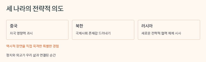 현장에서 외교 관계자들과 이야기를 나눠보니, 이번 회담은 군사 협력이나 경제 지원을 포함한 실질적인 합의로 이어질 가능성이 높다고 해요. 러시아는 자국의 방산 산업을 강화하기 위해 북한의 기술 협력을 원하고 있고, 북한은 에너지나 자원 공급 측면에서 러시아와의 협력을 확대하려는 입장이에요. 중국이 이런 흐름을 조율하면서 동북아 외교 구도를 새롭게 짜는 느낌이 강했어요. 제가 직접 본 회담 분위기는 긴장보다는 오히려 친근하고 자연스러웠는데, 이런 모습은 과거 냉전시대 동맹 관계를 떠올리게 했어요. 앞으로 국제정세에서 북중러가 어떤 공조체제를 구축할지가 굉장히 흥미로운 관전 포인트가 될 것 같아요.