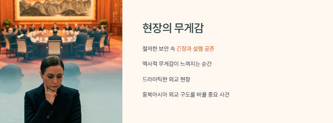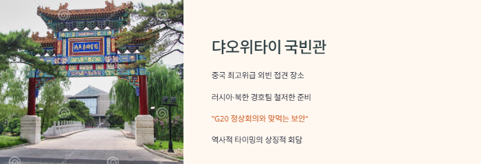 이날 회담 장소였던 댜오위타이 국빈관은 중국 최고위급 외빈이 머무는 공간으로, 주변이 고즈넉하면서도 매우 엄격한 보안이 느껴지는 곳이에요. 현장에서는 러시아와 북한 경호팀이 각각 따로 움직이는 모습을 볼 수 있었는데, 두 나라가 얼마나 철저히 준비했는지를 알 수 있었습니다. 이번 회담을 취재하던 기자들이 “이 정도 보안은 G20 정상회의와 맞먹는다”라는 농담을 할 정도였어요. 전승절 기념일이라는 상징적인 타이밍에 맞춰 이런 정상회담이 열렸다는 것만으로도 외교사에서 오래 회자될 장면이라는 생각이 들었어요.