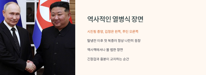 2. 북중러 세 지도자가 전승절 열병식에서 나란히 선 역사적인 장면의 의미를 해석합니다.