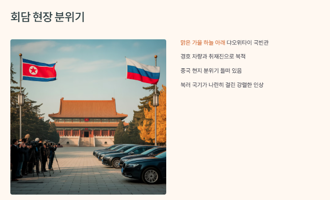 베이징의 가을 하늘은 여느 때보다 맑았고, 댜오위타이 국빈관 주변은 경호 차량과 취재진으로 북적거렸어요. 현장에서 직접 느낀 첫인상은 “이건 보통 이벤트가 아니구나”였죠. 저도 이번 전승절을 계기로 베이징에 잠깐 머물고 있었는데, 중국 현지 분위기는 이미 며칠 전부터 들떠 있었어요. 중국 친구들 사이에서도 이번 행사 이야기가 자주 나왔고, 특히 북한과 러시아 지도자가 동시에 베이징을 찾는다는 소식은 굉장히 특별한 뉴스로 다뤄졌어요. 국빈관 근처에 설치된 경찰 차단선 너머로 북러 국기가 나란히 걸려 있는 모습은 뉴스에서 보던 것보다 훨씬 강렬한 인상이었죠.