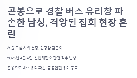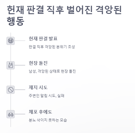 현장의 목격자들에 따르면, 남성은 헌재 판결이 나오자마자 격앙된 상태로 현장으로 돌진했다고 한다. 누군가는 그를 말리려 했지만, 곤봉을 든 그는 이미 판단 능력을 상실한 듯 행동했다. 경찰이 체포한 직후에도 그는 분노를 삭이지 못하는 모습이었다고 전해진다.