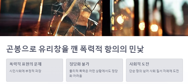 곤봉으로 유리창을 깬 폭력적 항의의 민낯