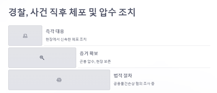 이번 사건에서 경찰은 즉각적인 제압에 나섰고, 위험 상황은 빠르게 통제되었지만, 곤봉으로 경찰 버스 유리창을 부순 남성의 행위는 시민들과 여론에 적잖은 충격을 안겼다. 공공 기물을 대상으로 한 물리적 공격은 엄중히 다뤄야 하는 사안이다.