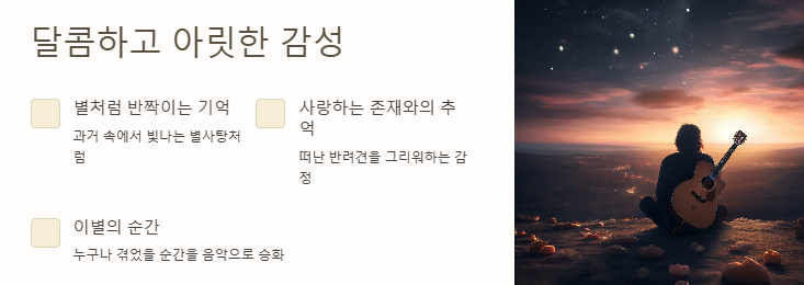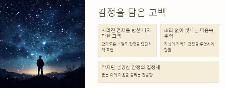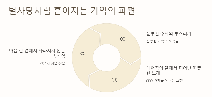 마지막으로 ‘별사탕 이야기’는 “기억의 노래로 남겨진 감정”, “사랑이 흘러간 자리의 잔상”, “작고 소중한 존재를 노래하는 멜로디”로 요약할 수 있다. 이러한 표현은 단순한 설명을 넘어 청자의 마음속 깊은 곳을 울리는 울림을 전한다.