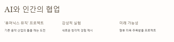 특히 AI와 인간 아티스트의 협업이라는 ‘휴머닉스 뮤직’ 프로젝트의 특징은 기존 음악 산업의 틀을 깨는 도전으로 평가받는다. 감성적이면서도 실험적인 시도를 통해 새로운 청각적 경험을 제시하는 이 프로젝트는 향후 더욱 주목받을 가능성이 크다.