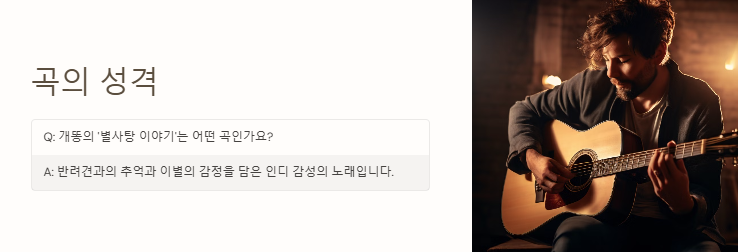 A: 반려견과의 추억과 이별의 감정을 담은 인디 감성의 노래입니다.