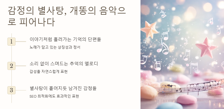 개똥의 ‘별사탕 이야기’는 단순한 음악 이상이다. 이 곡은 우리가 잊고 지냈던 소중한 기억들을 다시 꺼내어, 말하지 않아도 느껴지는 위로를 건넨다. 삶과 음악, 그리고 감정의 연결고리 속에서 우리는 또 하나의 ‘별사탕’을 마음속에 품게 된다.