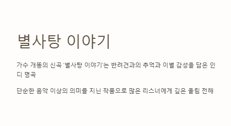 이 곡을 통해 개똥은 대중과 더 깊은 정서적 연결을 시도하고 있다. 반려견을 떠나보낸 경험이 있는 이들이라면 특히 이 곡을 들으며 자신의 기억을 떠올리고 위로를 받을 수 있을 것이다.