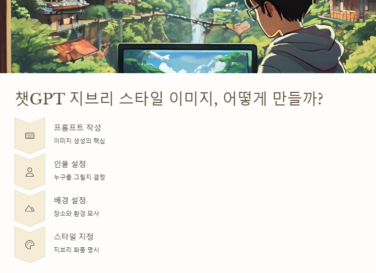 챗gpt 지브리 사용하는법은 다음과 같은 5단계로 요약됩니다.