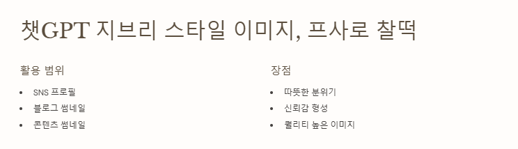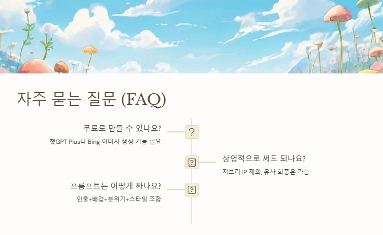 챗GPT 지브리 스타일로 생성된 이미지는 SNS 프로필, 블로그 썸네일, 콘텐츠 썸네일 등에 널리 활용되고 있습니다. 특히 지브리 감성은 누구에게나 익숙하고 따뜻한 분위기를 주기 때문에, 브랜드나 개인 아이덴티티에 신뢰감을 더해줍니다.