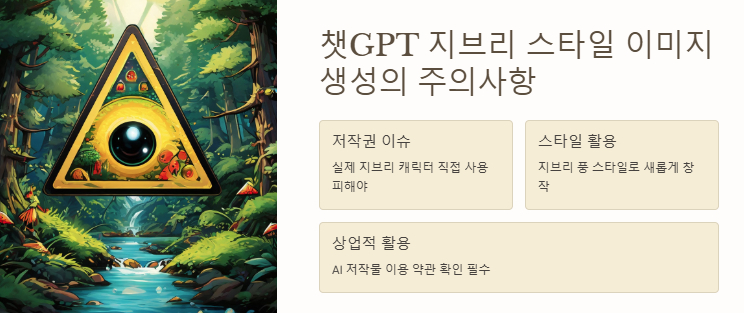 지브리 스타일은 저작권 이슈에 민감할 수 있습니다. 실제 지브리 캐릭터를 직접 사용하는 것은 피해야 하며, 지브리 풍 스타일로 새롭게 창작한 이미지를 사용하는 것이 중요합니다.