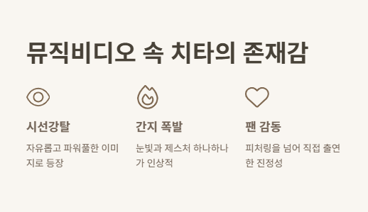내가 제일 놀란 건 뮤비에서 치타 언니가 직접 출연했다는 거야. 완전 자유롭고 파워풀한 이미지로 등장해서 시선강탈! 김완선 언니도 진짜 멋졌지만, 치타의 눈빛과 제스처 하나하나가 진짜 간지 폭발이었어. 피처링만 한 게 아니라, 뮤직비디오까지 출연했다는 게 진짜 감동.