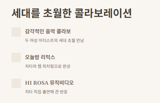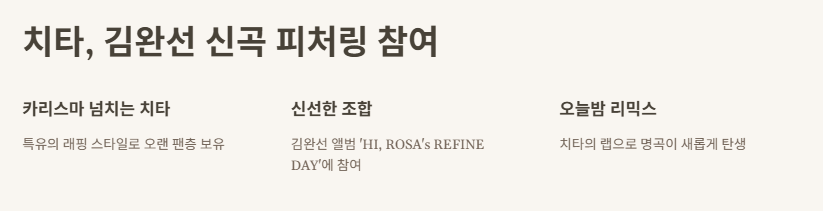 사실 나는 원래부터 치타 언니 진짜 좋아했거든. 카리스마 있는 무대랑, 그 특유의 래핑 스타일이 너무 멋있어서 고등학교 때부터 계속 플레이리스트에 넣어두고 들었어. 근데 이번엔 김완선 언니의 앨범에 피처링이라니… 진짜 신선한 조합이지 않아?