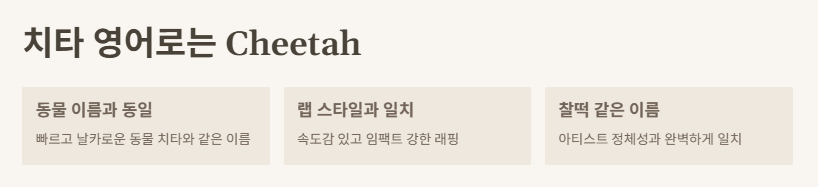 요거 살짝 TMI지만, 친구랑 이야기하다가 ‘치타 영어로 뭐야?’ 해서 검색해봤는데... ‘Cheetah’라는 동물 이름이랑 같더라고! 그래서 그런가, 랩 할 때 속도감이나 임팩트가 진짜 치타처럼 빠르고 날카롭다니까. 이름도 진짜 찰떡.