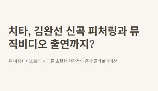 안녕! 오늘은 진짜 깜짝 놀랄만한 이야기를 들고 왔어. 내가 요즘 진짜 푹 빠져있는 두 여성 아티스트가 있는데, 바로 치타랑 김완선이야! 그런데 이번에 이 둘이 같이 작업을 했다는 거 있지? 이거 완전... 나만 몰랐던 거야?