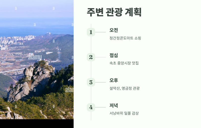 청간정콘도마트는 속초와도 가까운 위치라 관광 루트 짜기도 좋아요. 차로 15분 거리에는 속초 중앙시장도 있고, 인근에는 설악산, 영금정, 서낭바위 같은 관광지도 있어서 쇼핑 겸 여행이 가능합니다. 오전에 마트 이용하고 오후엔 드라이브 코스로 추천!