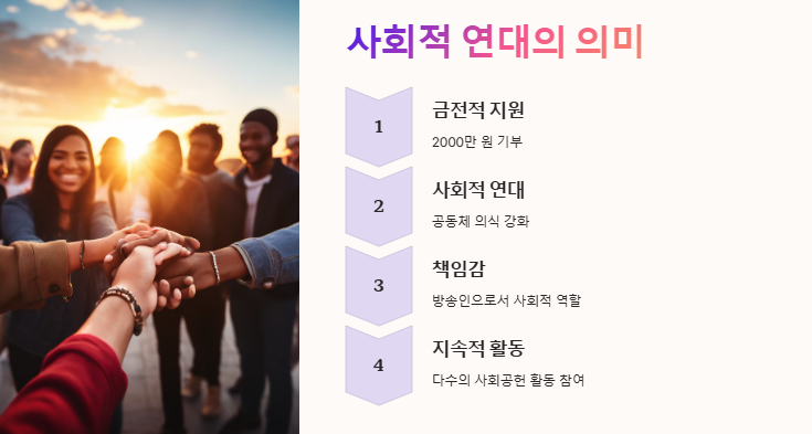 이번 기부는 단순한 금전적 지원을 넘어선 사회적 연대의 의미가 크다. 최화정 산불 기부는 그녀의 오랜 방송 활동만큼이나 깊이 있는 책임감에서 비롯된 것으로 보인다. 실제로 그녀는 방송 외에도 다수의 사회공헌 활동에 꾸준히 참여해왔다.
