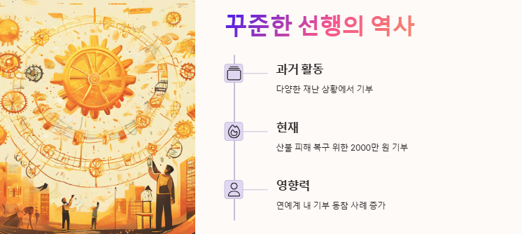최화정은 과거에도 다양한 재난 상황에서 기부를 아끼지 않았던 인물이다. 이번 산불 피해 복구를 위한 기부 역시 그녀의 꾸준한 선행 중 하나로 기록될 것이다. 연예계 내에서도 그녀의 기부를 본받아 동참하는 사례가 늘고 있다.