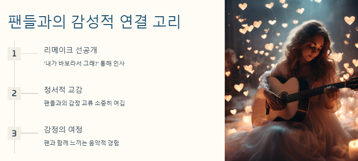 츄는 컴백 전 리메이크 음원 ‘내가 바보라서 그래?’를 선공개하며 팬들에게 따뜻한 인사를 전했다. 팬들과의 정서적 교감을 소중히 여기는 츄의 태도는 이번 앨범을 더욱 특별하게 만든다. ‘츄 4월 컴백’은 그저 음악을 들려주는 것이 아니라, 팬과 함께 느끼는 감정의 여정이라 할 수 있다.