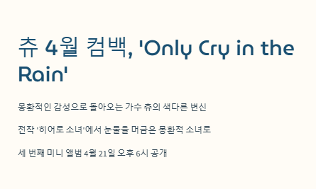 이번 앨범 ‘Only Cry in the Rain’은 제목에서도 알 수 있듯이, 감성적인 무드가 강하게 느껴진다. 츄의 성장과 음악적 깊이를 확인할 수 있는 중요한 시점이 바로 이번 ‘츄 4월 컴백’이다. 다양한 장르적 시도는 물론, 감정을 섬세하게 다룬 가사와 멜로디가 기대감을 더한다.