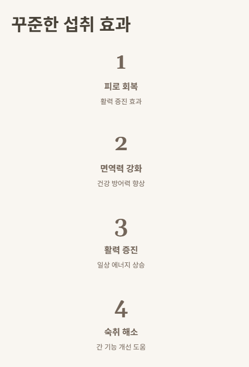 피로 회복, 면역력 강화, 활력 증진, 숙취 해소 등 종합적인 건강 개선 효과가 있습니다.