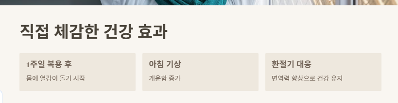 1주일 정도 꾸준히 마셔보니 확실히 몸에 열감이 돌고 아침에 일어날 때 개운해지는 변화가 있었어요. 특히 면역력 약한 제가 환절기를 잘 넘기게 된 것도 이 진액 덕분이 아닐까 싶어요.