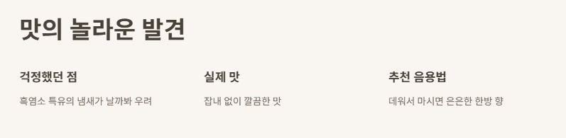 흑염소 진액이라고 해서 처음엔 냄새 날까봐 걱정했지만, 대구 덕양리한방흑염소 진액은 잡내 없이 깔끔한 맛이었어요. 특히 데워서 마시면 은은한 한방 향이 퍼지면서 따뜻하게 속을 채워주는 느낌이었답니다.