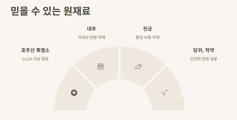 대추, 천궁, 당귀, 작약 등 국내산 한방 약재가 들어가 있고, 호주산 흑염소 원물이 71.4% 이상 함유돼 있다는 점에서 신뢰도가 높아요. 한방 느낌이 강하면서도 건강한 느낌이 바로 느껴졌습니다.