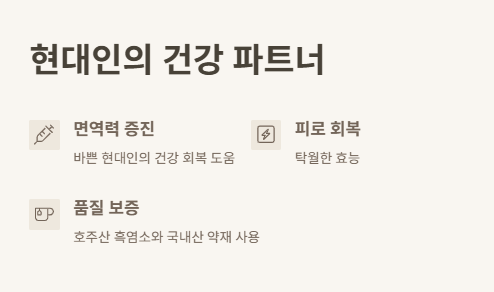 피로 회복, 면역력 강화, 활력 증진, 숙취 해소 등 종합적인 건강 개선 효과가 있습니다.