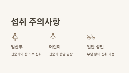임산부나 어린이는 전문가와 상의 후 섭취를 권장합니다. 일반 성인에겐 부담 없습니다.