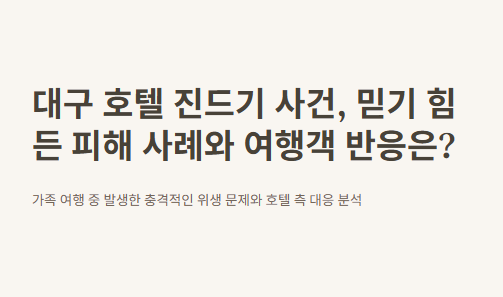 여러분 안녕! 오늘은 조금 충격적인 이야기를 들고 왔어. 바로 대구 호텔 진드기 사건인데, 여행 가기 전에 꼭 알고 가면 좋을 정보라서 내가 직접 정리해봤어. 사실 나도 여행 엄청 좋아하거든? 이번 여름방학 때 친구들이랑 대구 여행 계획 세우고 있었는데, 요 사건 보고 진짜 깜짝 놀랐지 뭐야. 그래서 정보 모으면서 같이 공유하려고 글 써볼게!