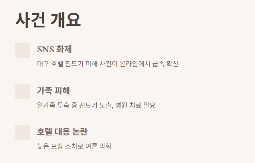 이렇게만 해도 조금은 안전하게 숙소 고를 수 있을 것 같아. 대구 호텔 진드기 사건처럼 피해가 커지기 전에 예방하는 게 제일 중요하니까 말이야.