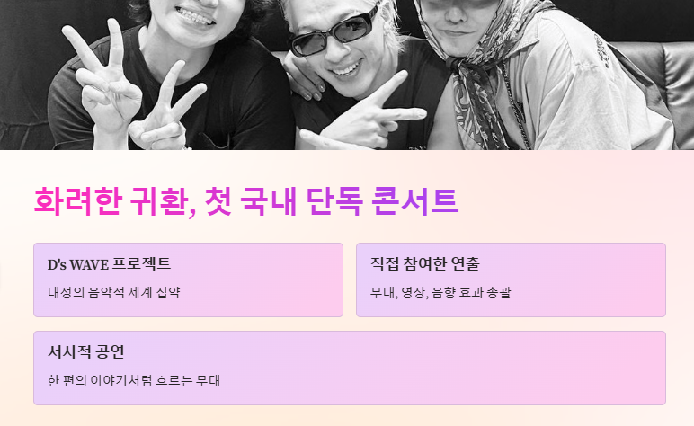 ‘D’s WAVE’는 대성의 음악적 세계를 시청각적으로 담아낸 프로젝트다. 이번 콘서트에서는 앨범의 수록곡을 중심으로 한 세트리스트와 대성이 직접 참여한 무대 연출, 영상, 음향 효과 등이 결합되며, 한 편의 서사처럼 흘러가는 공연이 완성되었다.