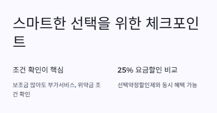 요즘은 단순히 ‘얼마 할인해주냐’보다 ‘내가 그 조건을 만족할 수 있냐’가 더 중요한 것 같아요. 예를 들면 보조금이 많다고 해도 이상한 부가서비스 5개나 같이 가입해야 하고, 해지하면 위약금 몇십만 원씩 물게 되는 조건도 있어서 진짜 꼼꼼하게 따져야 해요.