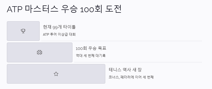 ATP 투어 이상급 대회에서 99회 우승을 기록하고 있으며, 100회에 도전 중입니다.