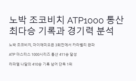 이 경기로 인해 조코비치는 ‘ATP1000 최다승자’라는 새로운 타이틀을 얻게 되었으며, 이는 그가 지난 20여 년간 꾸준히 최고의 자리를 지켜온 증거이기도 하다. 이번 글에서는 노박 조코비치의 ATP1000 우승 기록과 경기력을 다각도로 분석하며, 그의 커리어가 테니스 역사에 어떤 의미를 갖는지 조명하고자 한다.