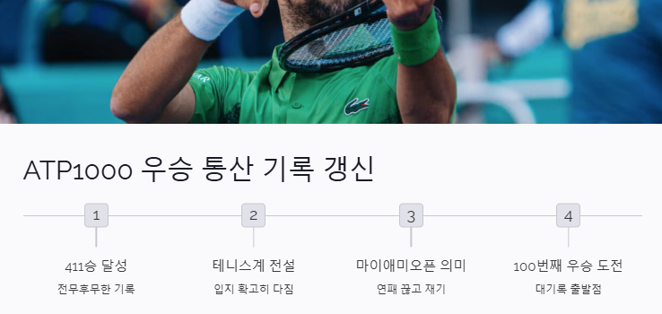 이번 마이애미오픈은 특히 조코비치에게 중요한 의미를 갖는다. 최근의 연패를 끊고 재기한 무대이자, 100번째 ATP 이상급 우승이라는 대기록에 도전하는 출발점이기 때문이다.