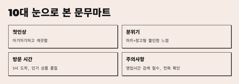 평일 오전 9시부터 오후 7시까지, 토요일은 6시까지며 일요일은 휴무일이 많아요. - 10대가 직접 다녀온 문무마트 후기