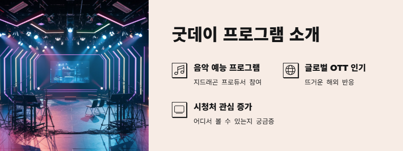 MBC 예능 ‘굿데이(Good Day)’는 지드래곤이 프로듀서로 참여하며 많은 화제를 모은 음악 예능 프로그램이다. 특히 글로벌 OTT 플랫폼에서 뜨거운 반응을 얻었으며, 어디서 ‘굿데이’를 볼 수 있는지에 대한 관심도 높아지고 있다. 본 글에서는 ‘굿데이 OTT 시청처’ 정보와 함께 프로그램의 인기 요인, 해외 반응, 향후 음원 발매 소식까지 상세히 정리했다.