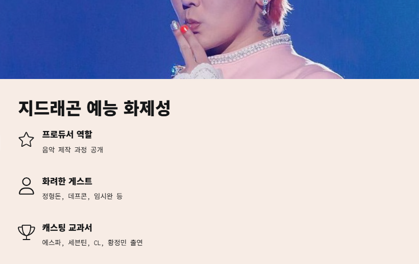 - 지드래곤의 음악 프로듀싱 – 지드래곤이 직접 참여한 음악 프로젝트는 그 자체로 큰 기대를 모았고, 그의 프로듀싱 능력은 프로그램의 매력을 한층 더 끌어올렸습니다.