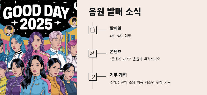 굿데이 OTT 반응이 뜨거운 가운데, 오는 4월 24일 공개 예정인 '굿데이 2025' 음원과 뮤직비디오는 또 다른 흥행 신호탄이 될 전망이다. 해당 음원은 수익금 전액을 소외 아동·청소년을 위한 기부에 사용할 예정이며, 이는 프로그램이 담고 있는 '좋은 날'이라는 메시지와도 연결된다.